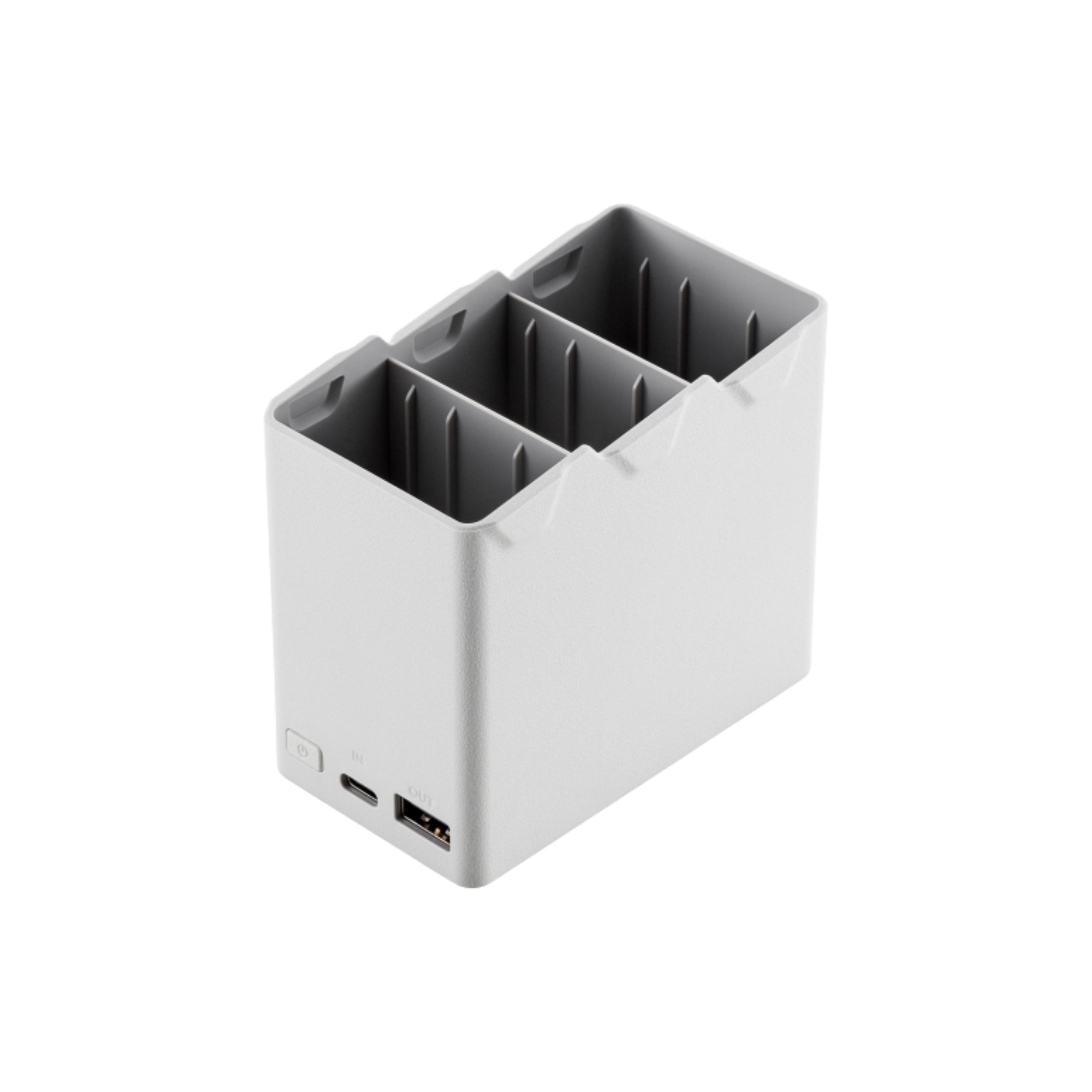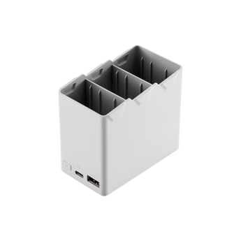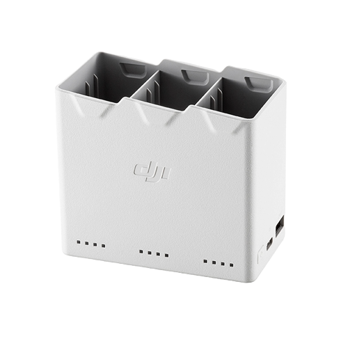 双向充电管家可依次为遥控器和三块电池充电,也可作为移动电源使用,存放电池方便携带。配合 DJI 30W USB-C 充电器,三小时即可充满三块智能飞行电池,四小时即可充满三块智能飞行电池 Plus。